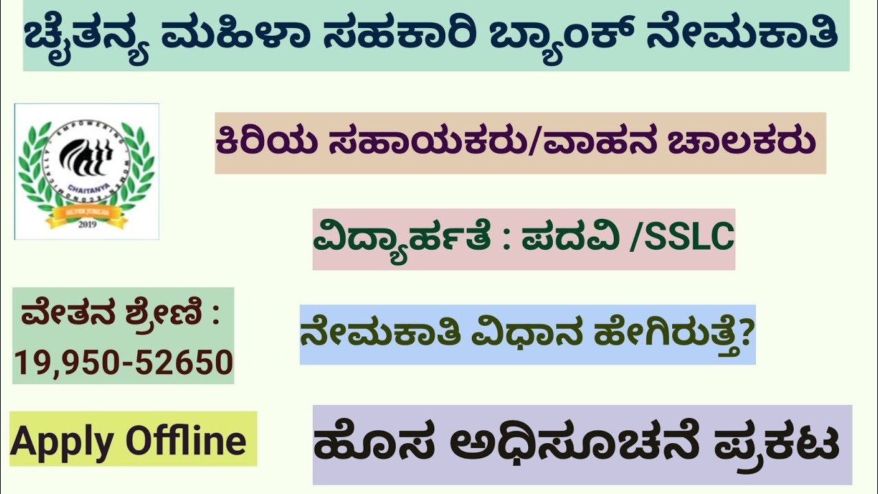 - ಚೈತನ್ಯ ಮಹಿಳಾ ಸಹಕಾರಿ ಬ್ಯಾಂಕ್ ನೇಮಕಾತಿ 2026: 10ನೇ ಪಾಸ್ ರಿಂದ ಪದವೀಧರರಿಗೆ ಸುವರ್ಣಾವಕಾಶ – ₹52,650 ವರೆಗೆ ಸಂಬಳ!