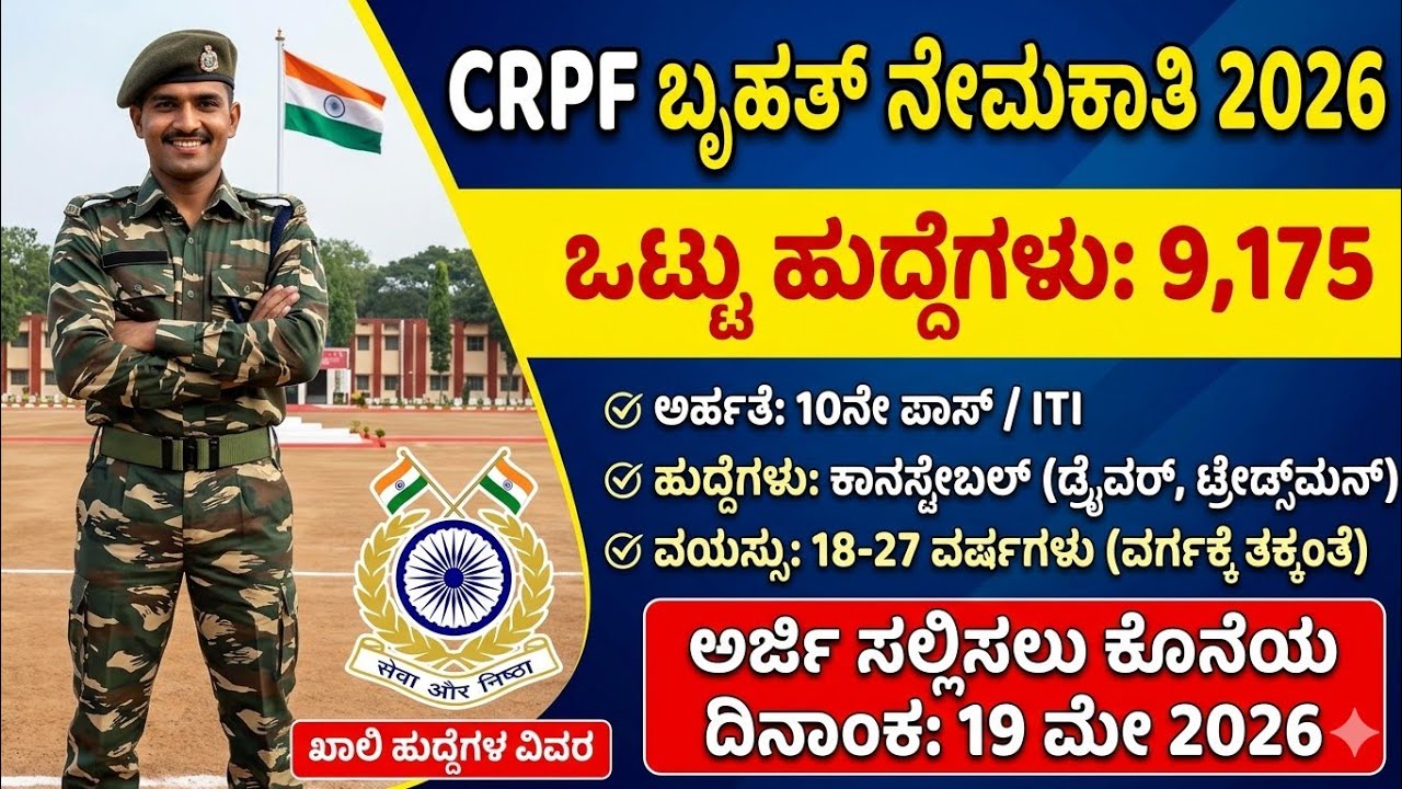 2026ನೇ ಸಾಲಿನ CRPF ನೇಮಕಾತಿ ಅಧಿಸೂಚನೆ ಪ್ರಕಟಗೊಂಡಿದ್ದು, ದೇಶದಾದ್ಯಂತ 9,195 ಕಾನ್ಸ್‌ಟೇಬಲ್ ಹುದ್ದೆಗಳು ಭರ್ತಿ ಮಾಡಲು ಅರ್ಜಿಗಳನ್ನು ಆಹ್ವಾನಿಸಲಾಗಿದೆ. 10ನೇ ತರಗತಿ ಪಾಸ್ ಅಭ್ಯರ್ಥಿಗಳಿಗೆ ಇದು ದೊಡ್ಡ ಅವಕಾಶವಾಗಿದ್ದು, ಕಡಿಮೆ ವಿದ್ಯಾಭ್ಯಾಸದಲ್ಲೇ ಸರ್ಕಾರಿ ಉದ್ಯೋಗ ಪಡೆಯಲು ಸಾಧ್ಯವಾಗಿದೆ.