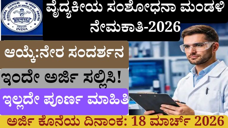 ಈ ಲೇಖನದಲ್ಲಿ ICMR Recruitment 2026 ಸಂಬಂಧಿಸಿದ ಸಂಪೂರ್ಣ ಮಾಹಿತಿ – ಹುದ್ದೆಯ ವಿವರ, ಶೈಕ್ಷಣಿಕ ಅರ್ಹತೆ, ಸಂಬಳ, ವಯೋಮಿತಿ, ಆಯ್ಕೆ ಪ್ರಕ್ರಿಯೆ, ಅರ್ಜಿ ಸಲ್ಲಿಸುವ ವಿಧಾನ ಮತ್ತು ಪ್ರಮುಖ ದಿನಾಂಕಗಳ ಬಗ್ಗೆ ಸಂಪೂರ್ಣ ವಿವರ ನೀಡಲಾಗಿದೆ.